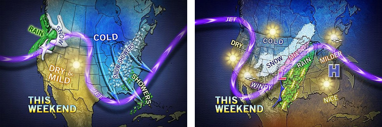 So the jet stream is a band of winds, north of which it is high pressure, and south of which is low pressure. Hot air rises, cold air falls, and in high pressure areas, air moves downwards making it dry, leaving the sky clear and generally creating nice weather. In low pressure areas, as the air is hot, evaporation happens causing liquid in the ground to form clouds and rain or snow. The jet stream is a wobbly band of winds (see photo below) so depending on how it’s wobbling you’ll have high or low pressure. What happens if you’re at the point where it’s switching from high to low? Well, if a cold front (cold air arriving at warm air) arrives then you get big rainstorms and thunder, while a warm front (warm air arriving at cold) creates more steady and less dramatic rain.