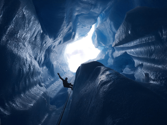 Meltwater can also start to form pipelines when flowing down into these cracks. These pipelines are called moulins and can go all the way to the base of the glacier. It is inadvisable to fall into one of these either.