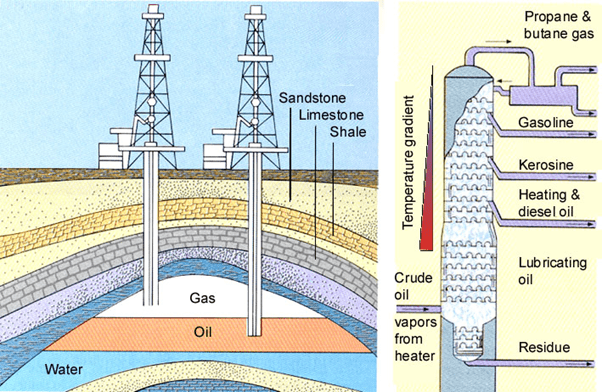 Alternatively, the petroleum may be in the form of crude oil. To access this, holes are drilled into the ground where there is known to be a pocket of oil in the rock, and then it is extracted. After this the crude oil goes through a process called fractional distillation where it is separated out into useful products. This includes gasoline (petrol), kerosene (widely used as airplane fuel), asphalt (used mostly to make roads), paraffin wax (used in many candles, polishes and cosmetics), and plastics (used in like… everything).